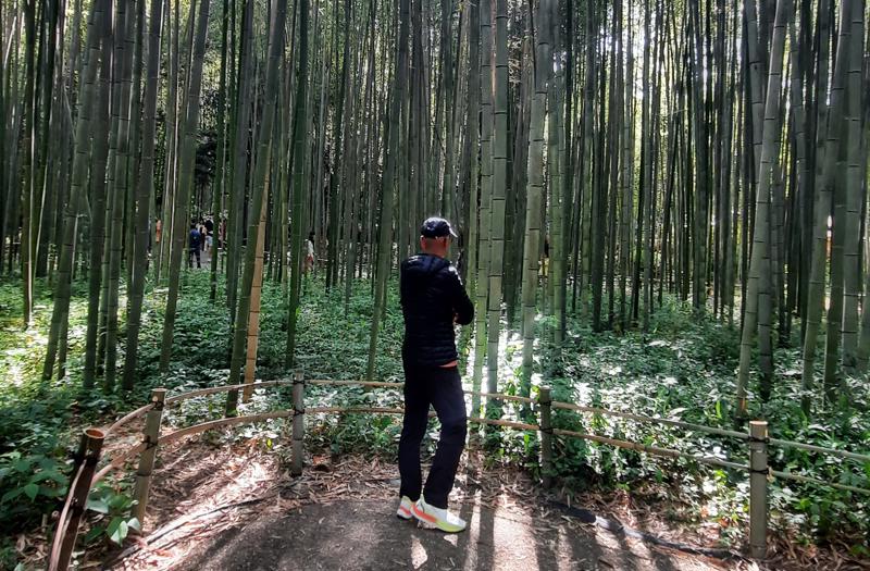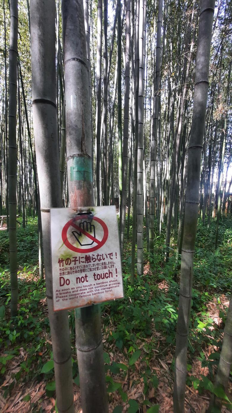 Jenis bambu yang mendominasi hutan ini adalah Moso-chiku (Phyllostachys edulis), yang secara botanis termasuk kelompok bambu monopodial. Akar rimpangnyaโrizomโtumbuh horizontal di bawah tanah, menjalar jauh dari tanaman induk, dan dari setiap titik di sepanjang rizom itu muncul batang yang berdiri sendiri. Tidak bergerombol. Tidak berhimpitan. Setiap batang memiliki ruangnya masing-masing, jarak yang leluasa dari tetangganya, sehingga sepertinya manusia bisa berjalan di antara mereka tanpa merasa terganggu.