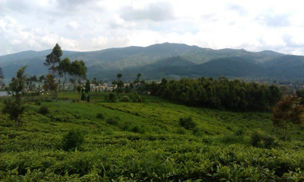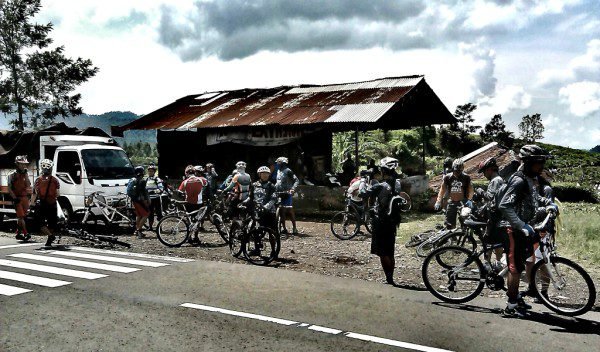 Beruntung sudah memasuki kebun teh sehingga segala penat bisa teredam oleh indahnya pemandangan dan segarnya udara pegunungan. “Yang penting bisa narsis,” begitu komentar salah satu peserta yang berhenti karena kecapaian dan meminta saya untuk memotret. Sambil mengangkat sepedanya, ia bergaya dalam pose yang pasti mengundang decak kekaguman. Latar belakang lembah kebun the yang menghijau dan nun jauh di sana pegunungan yang mengepung Garut.