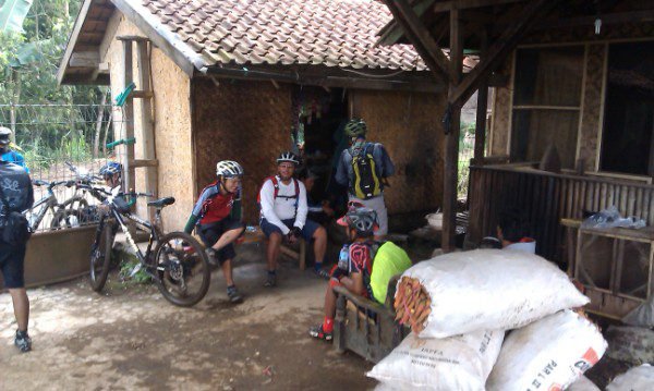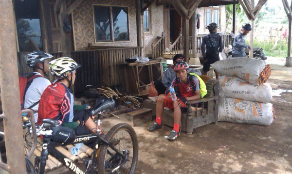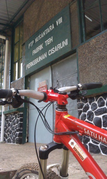 Setelah melalui single track berumput di tengah kebun teh, akhirnya pitstop pertama pun sampai. Tempat istirahat pertama sekaligus makan siang ini mengambil tempat pabrik teh Cisaruni yang berada di bawah pengelolaan PTP VIII. Pabrik teh ini sebagian sudah tidak dipakai, meninggalkan kerangka-kerangka besi yang tak terawat. Bekal makan siang yang dibawa masing-masing peserta pun segera dibuka dan disantap di bawah rindangnya pohon halaman pabrik.