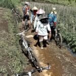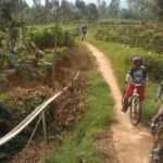 Tantangan etap kedua ini harus diakui adalah menyusuri jalan setapak serupa pematang di sawah. Hanya saja di sisi kiri selokan, di sisi kanan jurang sedalam antara satu dan tiga meter. Jika gowesan kita oleng sedikit, siap-siap memutuskan dalam hitungan sepersekian detik, mau jatuh ke sisi kiri atau sisi kanan. “Saya memutuskan jatuh ke sisi kiri dan melepas sepeda saya begitu ban depan terkena lubang yang tertutup rumputan,” kata Abah. Bisa dibayangkan jika jatuh ke kanan bisa menimbulkan cedera yang lumayan meski jatuh di tanah kebun. Di etape kedua ini memang banyak peserta yang terjatuh dari sepedanya. Ada yang tercebur di selokan karena tidak bisa menjaga keseimbangan, ada juga yang nyungsep saat menerabas “kali” kecil.