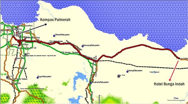 Kami menginap di Hotel Bunga Indah, Losarang Indramayu. Bangunan hotel cukup bagus. Malam itu musik hidup berdentum di bangunan tak jauh dari bangunan utama. Beberapa motor mulai menurunkan penumpangnya, gadis-gadis berpakaian minimalis. Tapi waktu sudah merangkak ke angka 11.