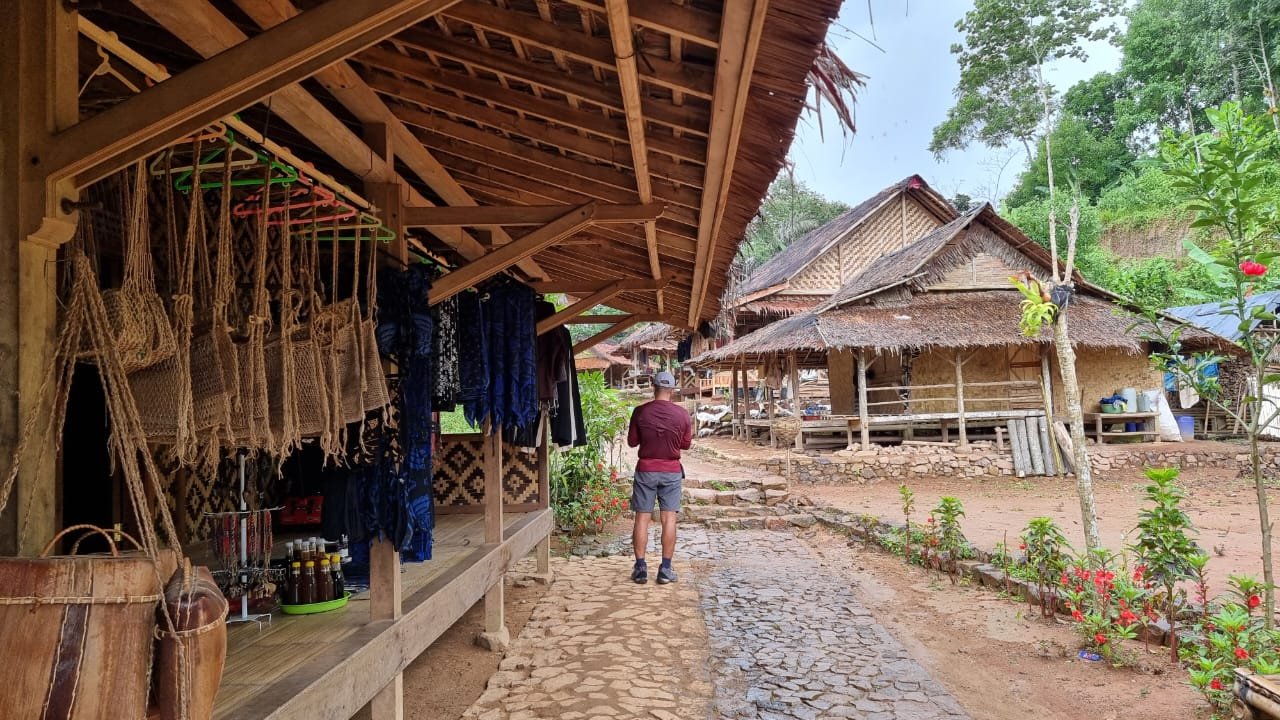 Selepas membayar tiket masuk sebesar Rp5.000 per orang, kami pun masuk ke kawasan Baduy Luar. Jalan berbatu masih basah oleh gerimis. Di kanan kiri berjajar warung sekaligus rumah. Menjajakan kerajinan khas Baduy, utamanya tenun. Di beranda beberapa perempuan Baduy menenun. Kita bisa bertanya-tanya soal proses menenun itu yang masih menggunakan alat tenun bukan mesin.