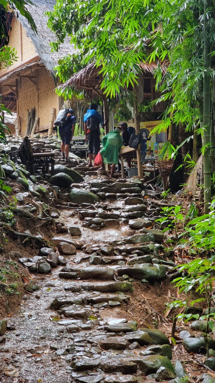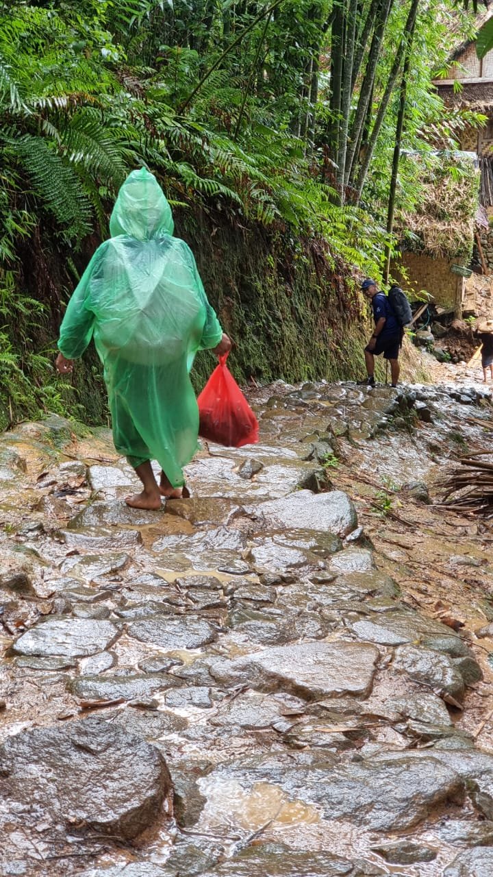 Sayangnya, meski dekat jaraknya namun jalannya dominan tanah. Tak ada pengerasan dengan batu selayaknya jalur Ciboleger – Baduy Dalam. Sementara hujan semalam masih menyisakan genangan air di banyak ruas jalan. Jadilah aku agak kerepotan ketika sendal sudah membawa lapisan tanah baik di solnya maupun di permukaan bagian atas. Licin dan bertambah berat. Terkadang jadi seperti terkena lem sehingga sendal susah diangkat.