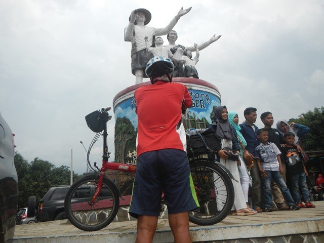 Sampai Stasiun Rangkasbitung setelah meluruskan sepeda masing2, kami kemudian sarapan di dekat Alun-alun Rangkasbitung. Selesai sarapan foto-foto di depan tulisan Rangkasbitung. Biar gak dikira hoax.