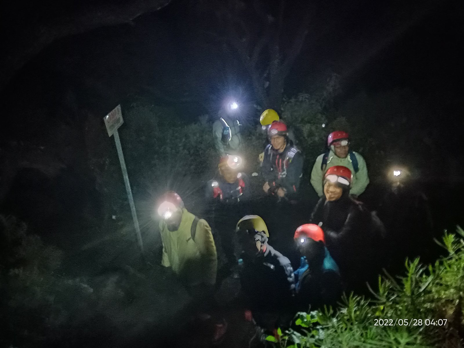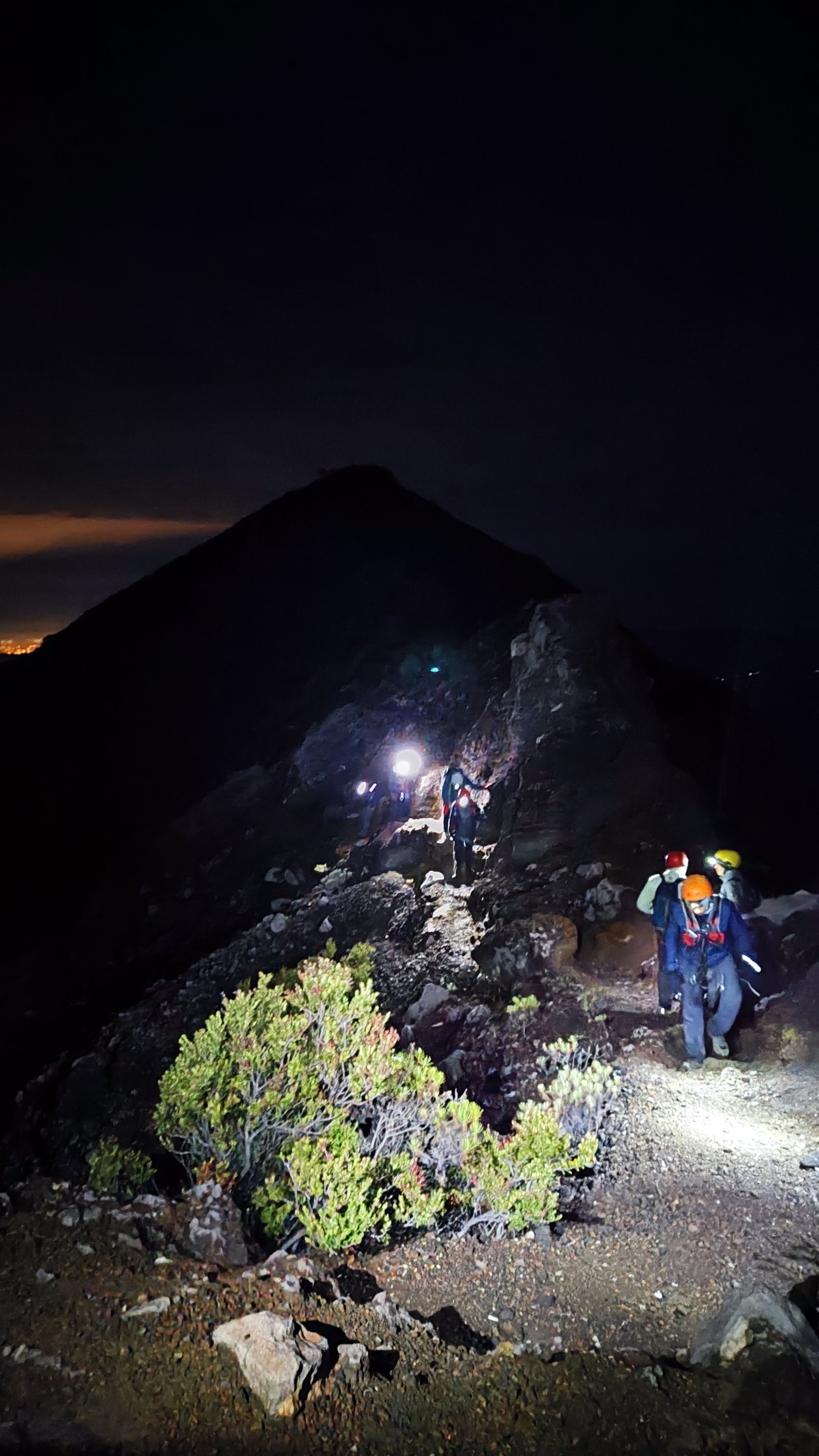 Hujan masih turun ketika kami siap-siap summit attack. Untung saja ketika mulai jalan hujan mereda dan akhirnya benar-benar berhenti. Kali ini jalur pendakian benar-benar gak sopan. Tanjakan ngehek kalau goweser bilang. Juga karena malam, meski sudah pakai headlamp, tiba-tiba saja kepala kepentok ranting atau dahan pohon.