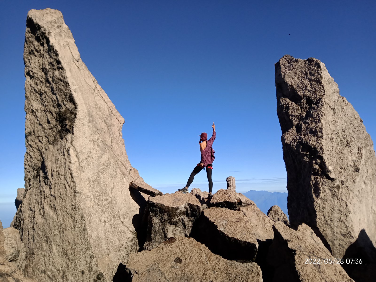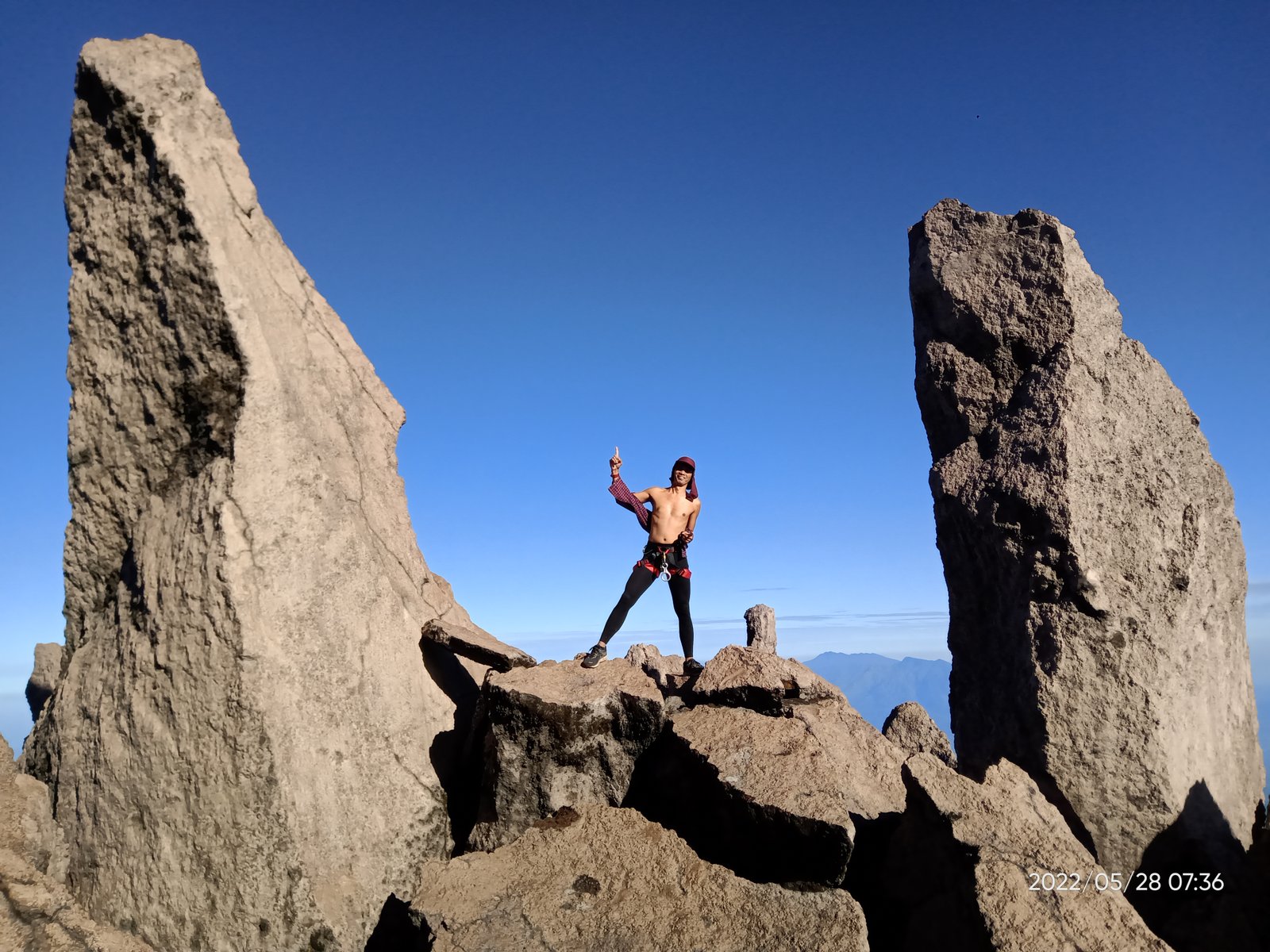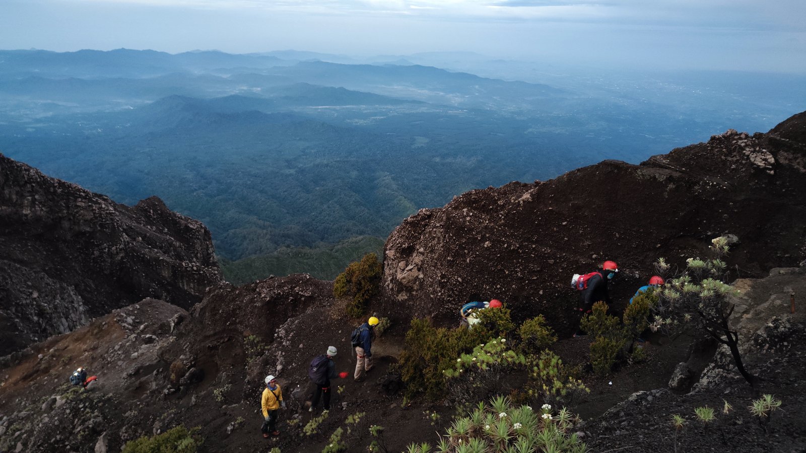 Puas berfoto kami pun menyudahi summit attack ini. Kembali berhati-hati menuruni tebing, melewati bebatuan, dan menyusur jembatan sirotol mustakim. Ketika matahari mulai menampakkan diri, baru terlihat kanan kiri jurang menganga.
