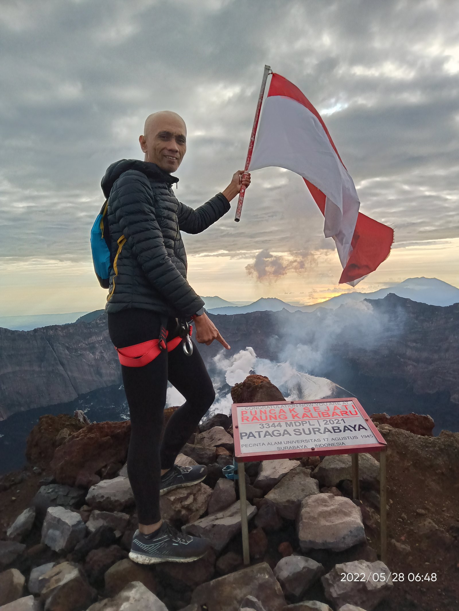Puncak bendera sebagai puncak pertama dari empat puncak di G Raung kami temui tak lama dari campsite 9 tadi. Di sini area mulai terbuka. Angin mulai terasa hembusannya. Waktu menjelang sunrise.