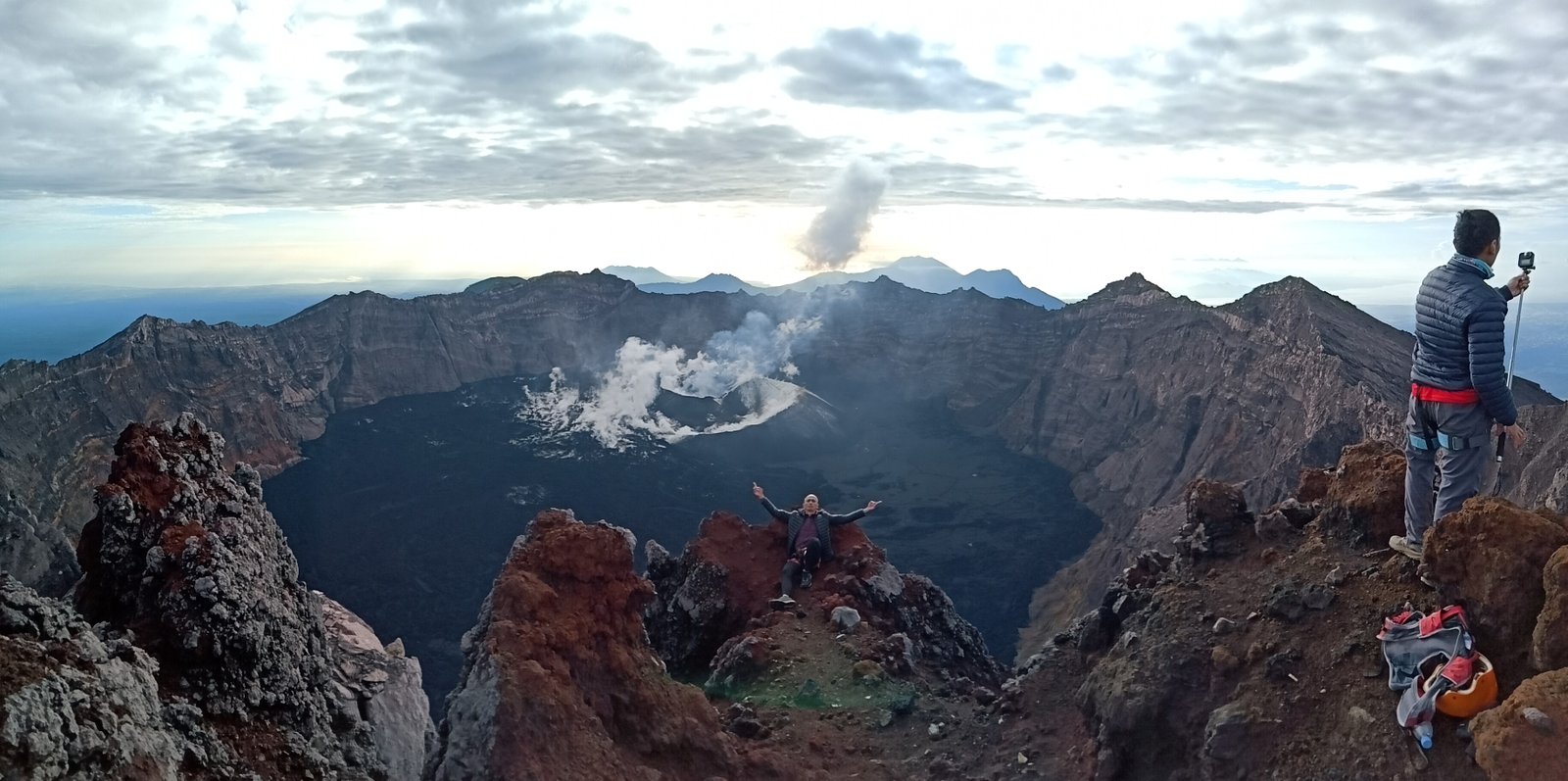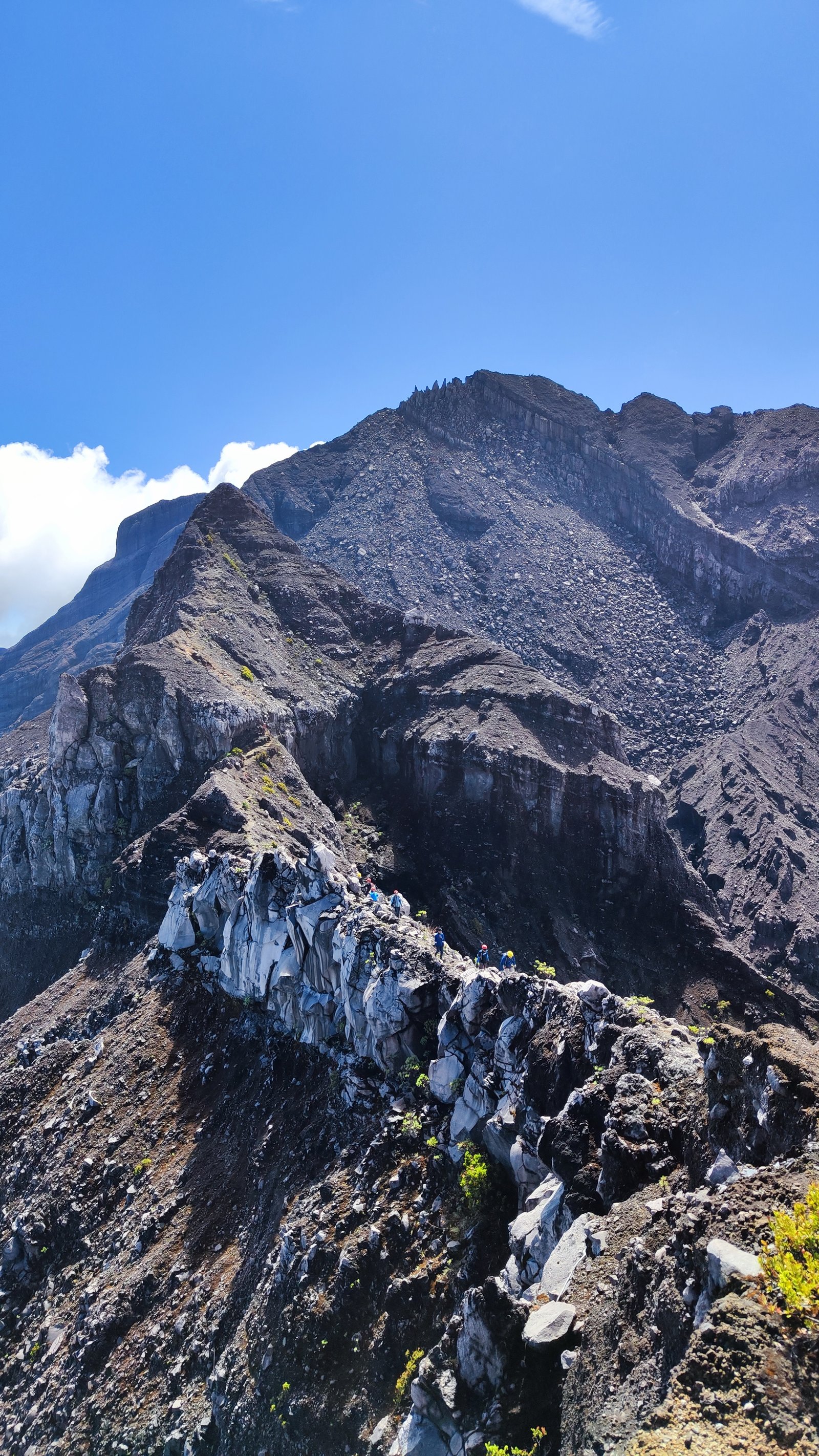 Puncak 17 sebenarnya di depan mata. Tapi karena beberapa jalur longsor maka ditutup. Jadinya hanya lewat di bawahnya sebelum kemudian menuruni tebing. Kali ini melakukan rapelling tapi turun. Lolos dari sini tantangan selanjutnya adalah menuju Puncak Sejati. Melintasi dinding kaldera dengan kemiringan sekitar 45 derajat dengan berpijak pada batu-batu bervariatif ukurannya dan sebagian dari mereka adalah batu lepasan. Di sinilah fungsi helm yang disuruh kita bawa dari bawah.
