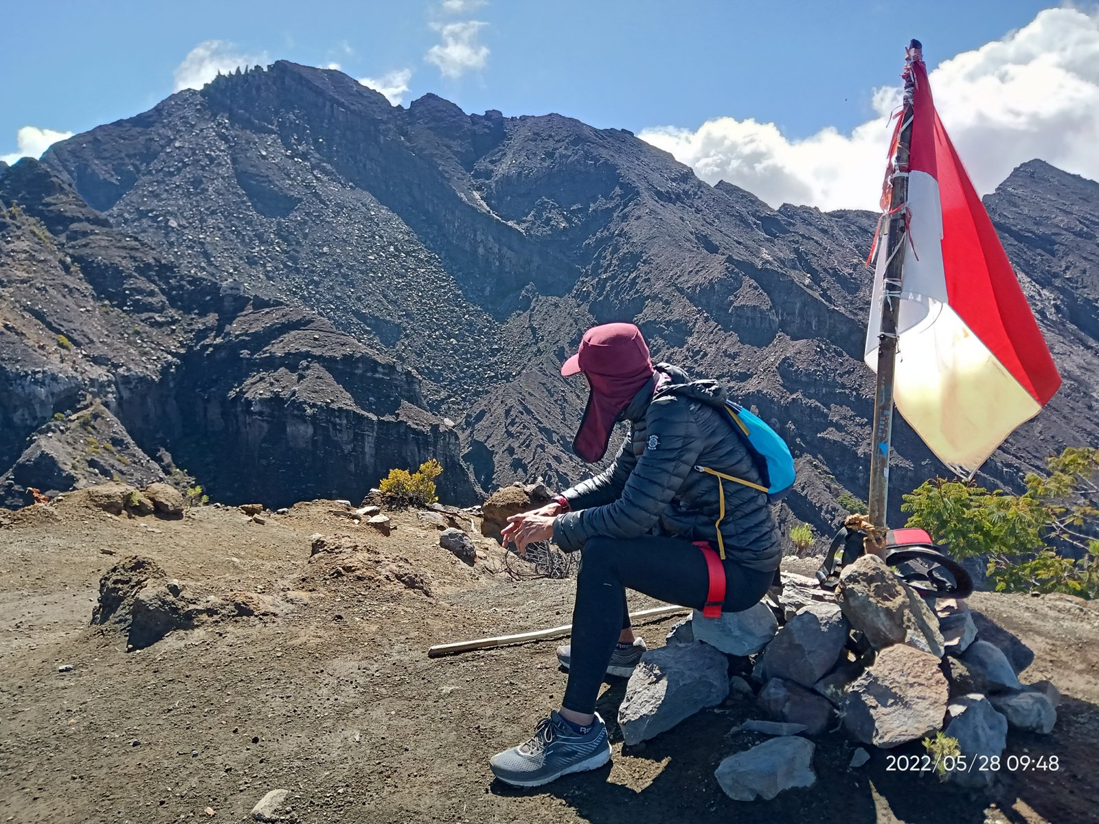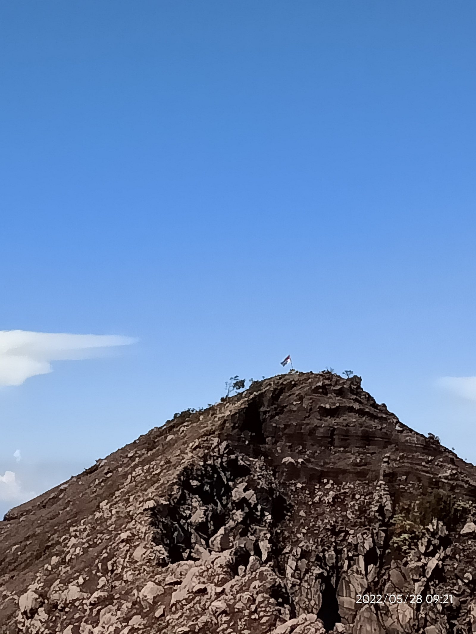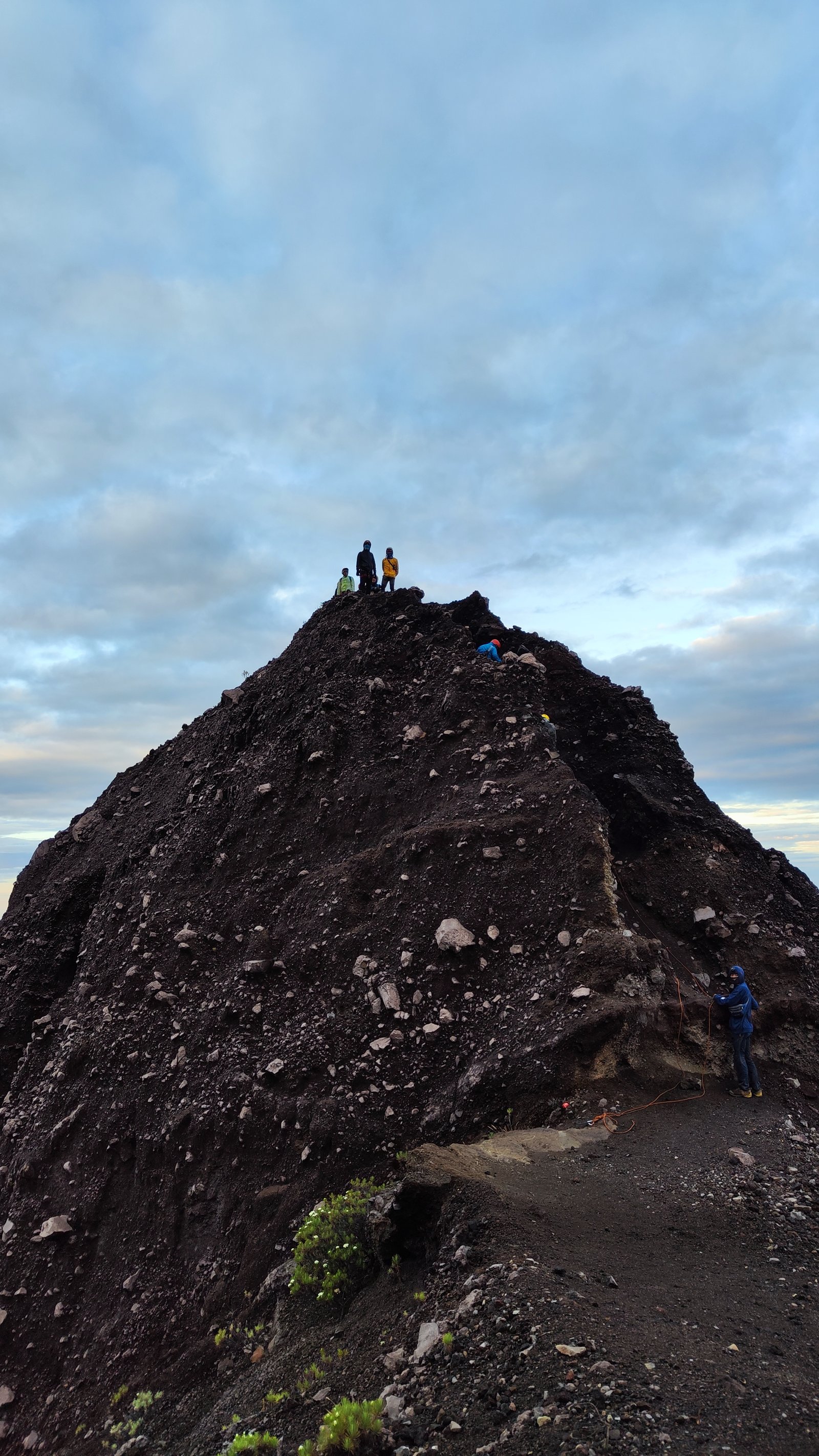 “Ayo, kita tak berlama-lama di sini. Target sunrise di Puncak Sejati. Trekking pole taruh di sini saja,” Pak Slamet yang lebih dikenal sebagai Pak Widi menyeru-nyeru kepada kami yang sibuk foto-foto di seputar bendera merah putih. (“Di daerah kami nama orangtua diambil dari nama anak pertama. Jadi bapak dikenal sebagai Pak Widi,” kata Widi yang juga menjadi guide mendampingi bapaknya.)