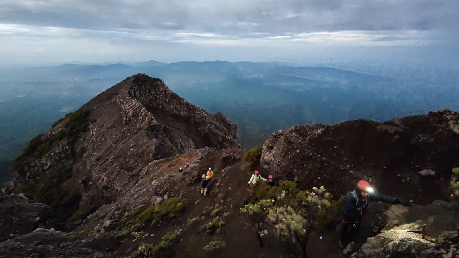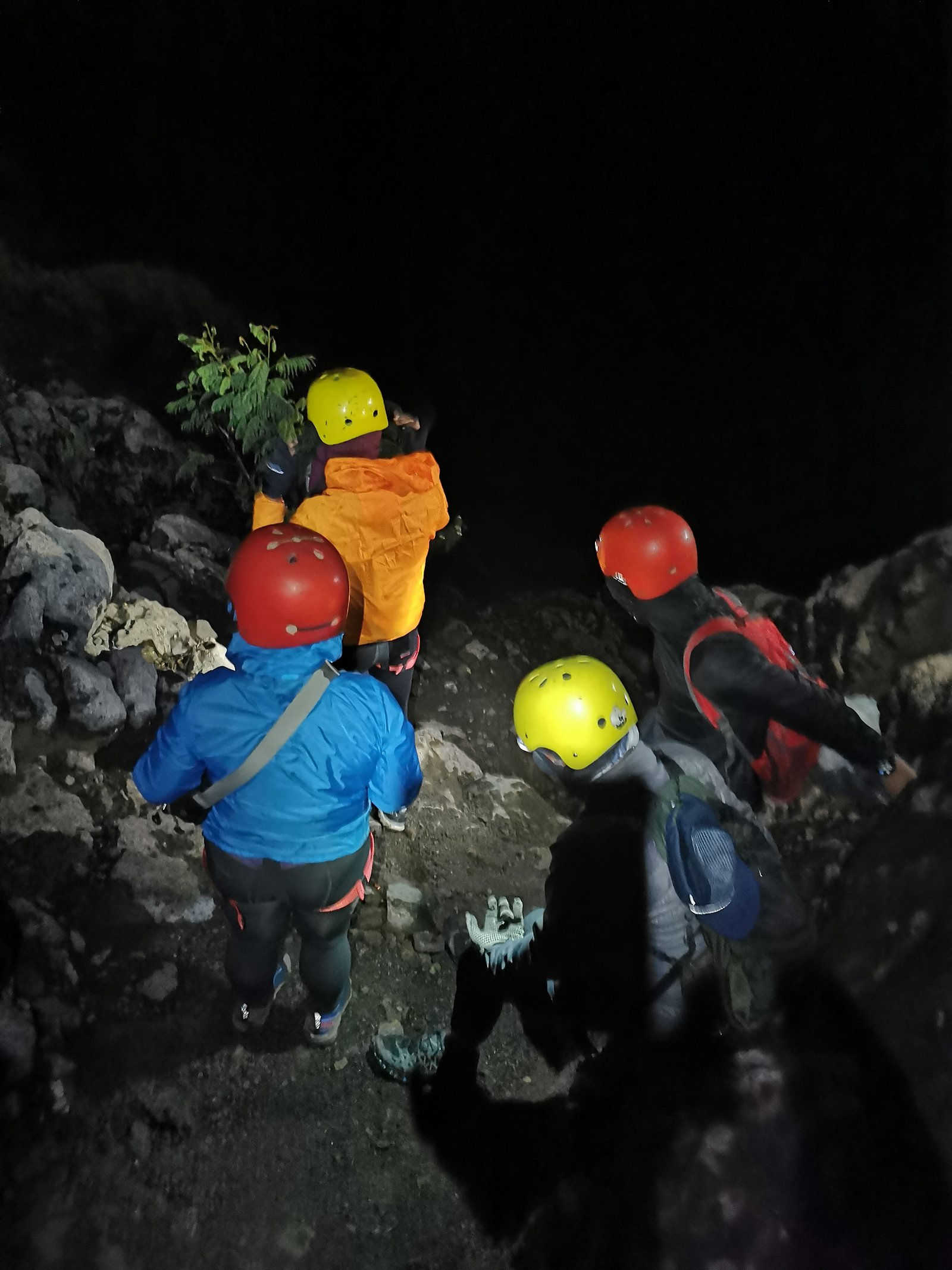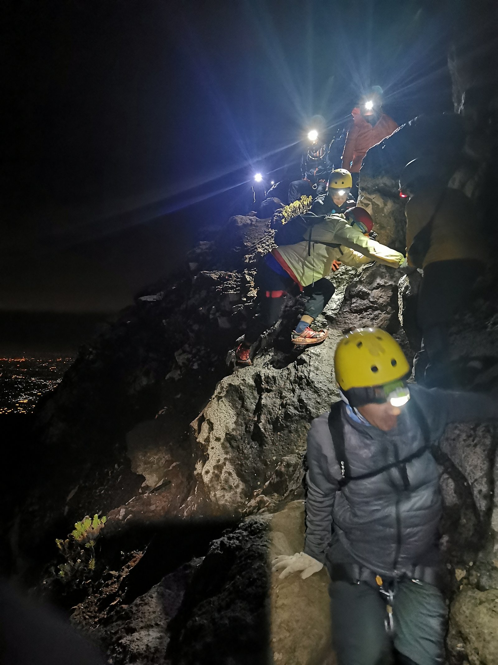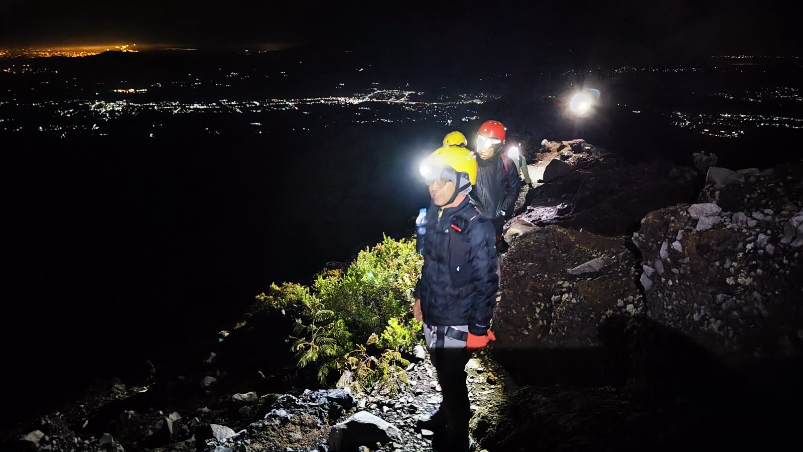 Di campsite 9 kami kumpul kembali untuk memasang harness. Dari sini kita bisa memandang kelap-kelip lampu dari kapal yang melayani penyeberangan Ketapang – Gilimanuk. Setelah semua memakai harness, kami pun bergerak untuk menuju ke puncak. Beruntung kami rombongan pertama sehingga bisa lebih leluasa bergerak.