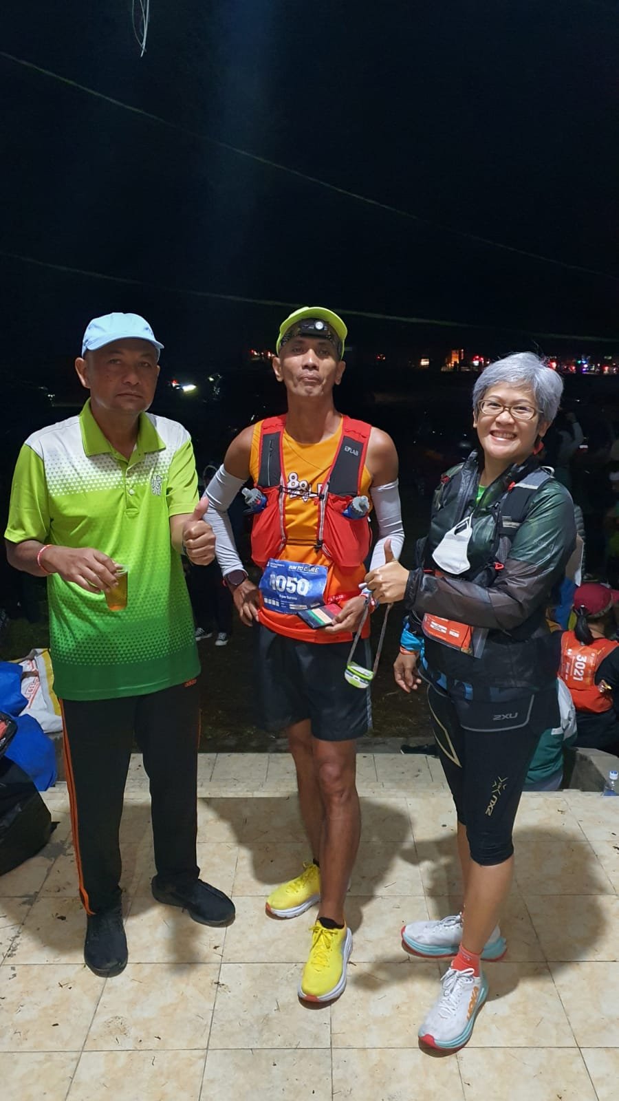 Selama di-fisio aku tak memperhatikan lagi “perabotan” tadi. Namun kaget begitu selesai di-fisio dan mau mengambil makanan, lampu kepala tidak ada. Aku mencari-cari mas Aji ternyata sudah tidak ada di lokasi. Aku telepon tidak diangkat. Sempat kelabakan bagaimana dengan penerangan nanti? Untung ada mas DL yang sudah selesai lari dan lampu kepalanya sudah purna tugas. Aku pinjam dan segera setelah selesai makan malam yang tidak habis aku bersiap-siap melanjutkan etape terakhir menuju titik finish.