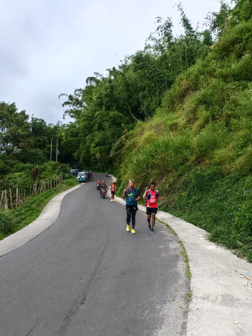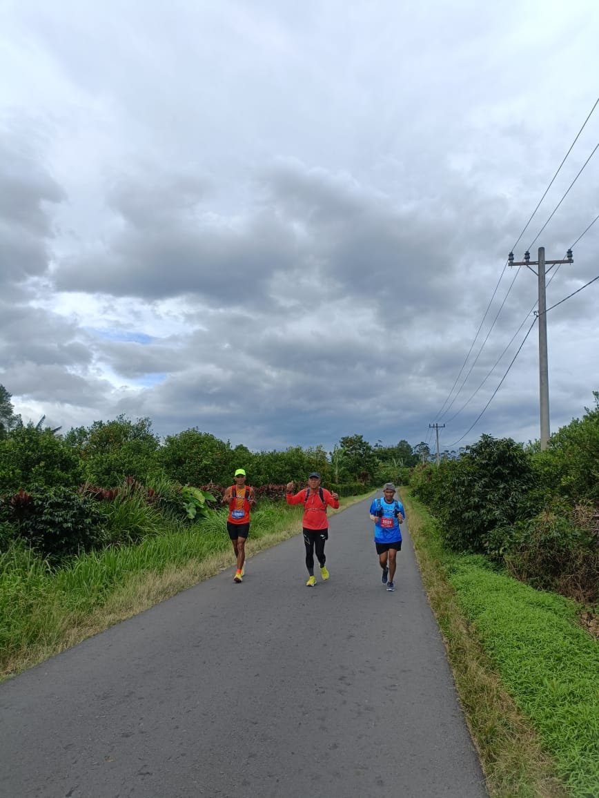Aku segera menaikkan pace dan mulai meninggalkan rombongan. Soalnya kalau kelewat COP, cut off point, otomatis langkahku mandeg di CP2. Padahal membayangkan dari CP2 ke finish tinggal “glundhung” saja sebab Brastagi di tempat tinggi dibandingkan dengan Medan.