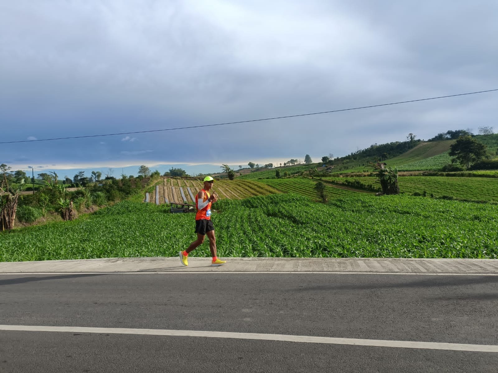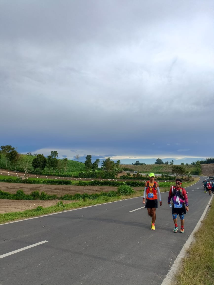Di WS 6 aku berhenti cukup lama dan ternyata muncul Mas DL yang Relay 3 dan Bang Asro yang ikut 100K. Akhirnya kami sepakat untuk berangkat bareng menuju CP2. Jalanan dari WS 6 ini relatif sepi karena seperti keluar dari jalan kabupaten atau provinsi. Kami bertiga jalan sambil ngobrol. Sesekali lari. Aku berbagi soal bagaimana tips berlari – jalan dengan konsisten. Pakai patokan tiang listrik. Selang-seling berjalan dan lari sesuai jarak antartiang.