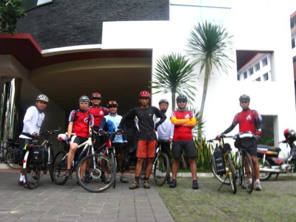 Begitulah, pada Jumat 8/4 kami berdelapan berangkat ke Bandung menggunakan travel dengan jam keberangkatan yang berbeda-beda. Ada empat kloter: Ari Dj berangkat dari Kalimalang menggunakan Cipaganti Travel; Dimas, Alfa, dan Mas Pung menggunakan Day Trans dengan jam keberangkatan pukul 18.30; aku, Didi, Fredy dengan Day Trans juga tapi berangkat pukul 19.30; dan Mas Nug berangkat paling akhir 20.30 dengan Day Trans. Selain Ari yang datang paling awal, rombongan Day Trans sampai di titik akhir di Simpang Dago hampir berbarengan. Akhirnya kami mencegat angkot Dago – Kelapa menuju ke Gedung Grha Kompas di Jln. Riau. Kami mengecek sepeda kami sebentar sebelum menuju ke Wisma PU tempat kami menginap.