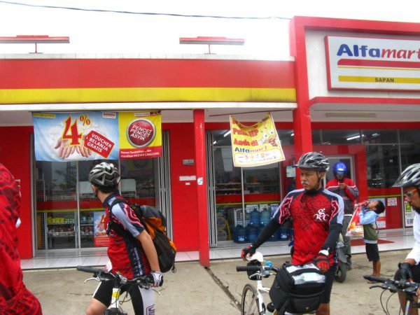 Pitstop pertama di Alfamart di daerah Tegalluar karena Alfa kebelet kencing. Entah kebetulan atau tidak Alfa memilih kencing di Alfamart. Jangan2 punyanya Alfa sebab untuk kencing harus melewati pintu bertuliskan “Hanya Karyawan yang Boleh Masuk”. Saya lupa mereset odometer di GPS sehingga tanya ke Alfa sudah berapa kilometer sampai di pitstop ini. “17,4 km,” jawab Alfa.