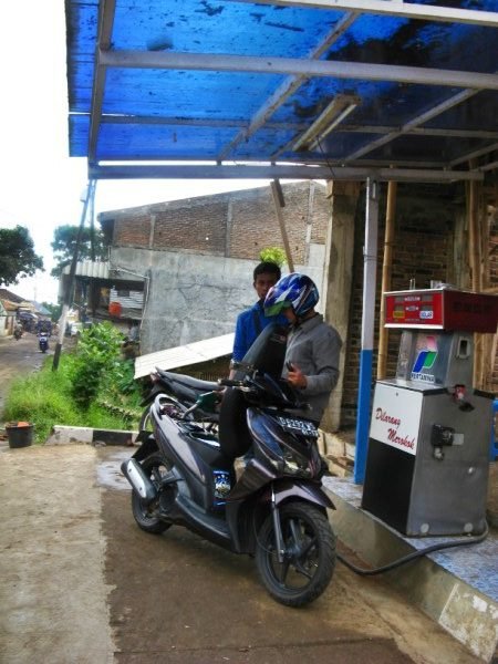 Mendekati Ibun barulah kami waspada. Jalan miring sudah mengintip. Ternyata ini baru pemanasan sebab semakin jauh jalannya semakin “kurang ajar”. Akhirnya saya terpaksa berhenti saat jalan mulai mendatar dan juga tertarik dengan pompa bensin pinggir jalan yang minimalis. Hanya ada satu dispenser, tak ada atap yang wah. Tulisan eh, lopo P dari Pertaminan hanya menempel di tubuh dispenser. Ternyata di sepanjang jalan banyak SPBU seperti ini. Bahkan ada yang berada di teras sebuah rumah. Entah di mana bunker minyaknya.