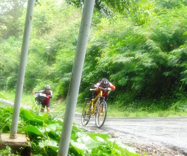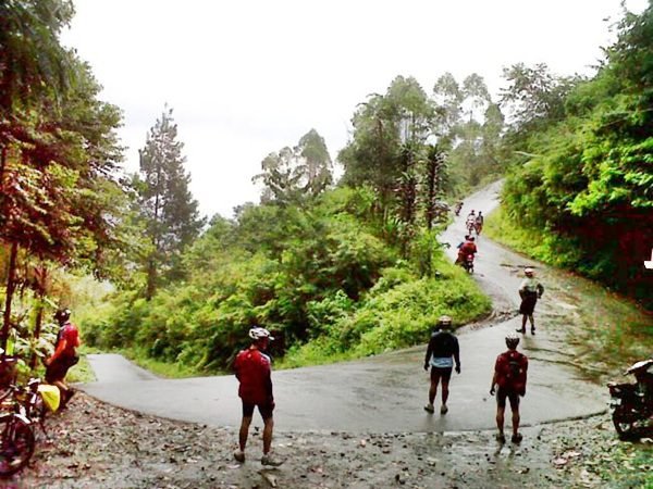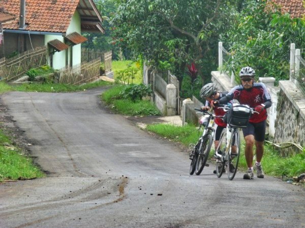 Alfa dan Mas Pung berangkat dahulu sementara saya menurunkan denyut jantung dulu. Setelah terasa stabil kembali menggowes. Mendahului Mas Pung yang masih menuntun akhirnya baru tahu di balik belokan tersimpan tanjakan aduhai. Hup hup … satu dua satu dua. Aku merapal jurus tangtun (maju terus pantang nuntun) mendaki jalan aspal yang ternyata jauh dari isu yang disebarkan lewat SMS: batu2 pada lepas. Tiba-tiba sebuah motor matik menyalip dan oh la la … tiba-tiba saja berhenti karena tidak kuat menanjak. Padahal tinggal beberapa meter lagi tanjakan berakhir. Pemboncengnya turun dan aku grogi sebab ternyata cleat masih terpasang. Setelah terlepas dan memulai gowesan lagi ternyata berat banget. Terpaksa TTB sampai akhir tanjakan yang ternyata sebuah jembatan.