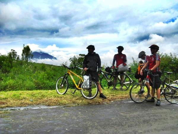 Sengaja saya memilih jalan yang agak kecil supaya tidak bertemu dengan angkutan umum yang besar seperti bus dan truk. Memang, agak sedikit lambat jalannya tapi udara lebih segar. Melewati jalan kampung dan persawahan ditambah dengan cuaca yang agak mendung memang mengasyikan. Sementara di sisi selatan sana berdiri deretan gunung yang salah satunya akan kami daki.