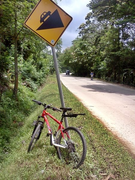 Kali ini saya mengayuh dan jalanan menanjak. Alhasil lebih banyak menunduk sambil memperhatikan marka jalan. Yang di pinggir tentunya sebab kalau di tengah bisa-bisa disambar kendaraan roda dua atau empat. Sudah minggir saja hampir saya diserempet mobil. Kejadiannya selepas Bumi Aki. Karena dari atas ada pemisahan jalur antara yang naik dan turun, kendaraan yang turun bisa ngebut di jalur satu arah sebelum masuk ke jalur dua arah. Nah, pas jalan nanjak itu saya tidak menyadari ada mobil kenceng dari atas yang mau mencoba masuk ke jalur kiri jalan dua arah. Saya kaget, begitu juga dengan pengendara mobil itu. Beruntung bahu jalan agak lebar sehingga bisa buat manuver. Ugh … jantung yang sudah bekerja keras bertambah debarnya karena kejadian itu.