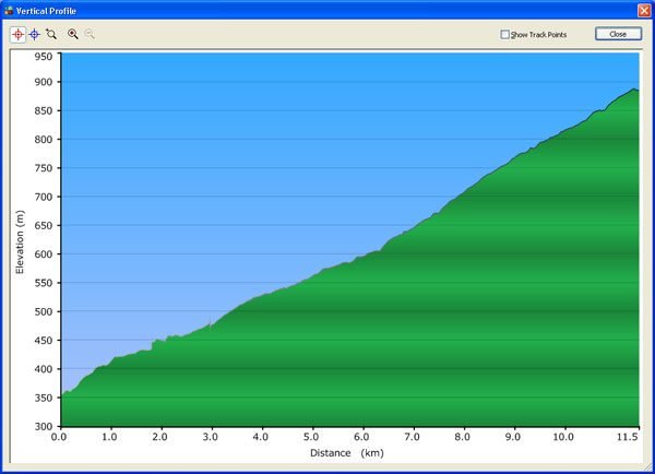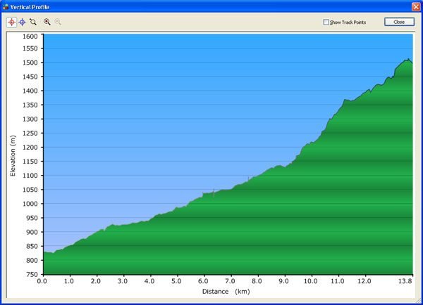 Puncak Pinus merupakan puncak tertinggi dari jalur ini. Makanya, setelah titik ini langsung turun. Hanya saja gak bisa leluasa sebab tanpa fender depan ternyata air muncrat ke muka. Juga GPS etrex-ku sering mati kalau terguncang-guncang keras. Turun sampai akhirnya di pertigaan Cikalong Kulon belok kanan ambil arah ke Taman Bunga Nusantara. Jalanan sempit beraspal dan sepi. Hmmm… cocok buat gowes nih. Setelah rolling, ketika berbelok langsung disapa dengan tanjakan. Saya pikir hanya sebatas pandangan mata, ternyata inilah perjuangan yang sesungguhnya. Sekitar 11,5 km ke depan jalanan menanjak landai, dari 350-an mdpl menuju ke hampir 900 mdpl. Beda dengan Tanjakan Cariu yang dari sekitar 220-an mdpl ke hampir 650 mdpl dalam jarak 5 km.